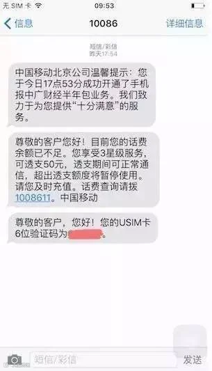 与此同时,嫌疑人再次利用许先生的账号密码登陆中移动网上营业厅,并办理“自助换卡”业务。骗子办理“自助换卡”后,中移动官方系统会给许先生发出短信提示“您6位USIM卡验证码为******”。
