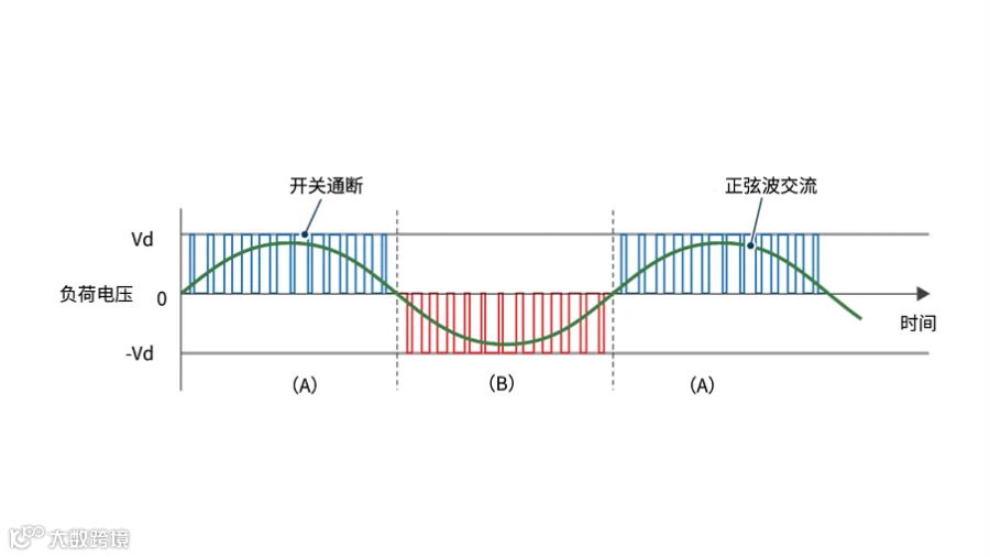 如果在矩形波的基础上,进一步提高开关频率,并调节每一次导通的时间,输出波形就能够接近正弦波。这种连续改变脉冲宽度的方法,被称为 PWM(脉冲宽度调制)。