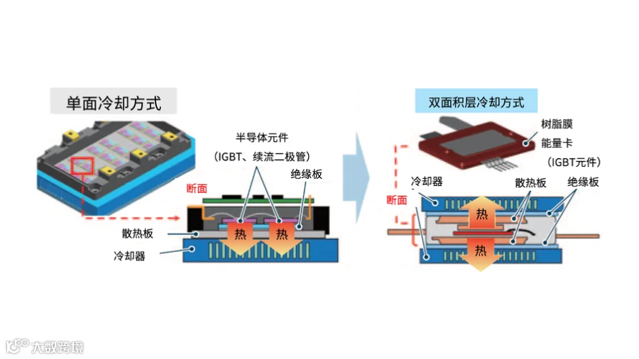 目前常见的做法是采用双面积层冷却。在这种结构中,集成 IGBT 的能量卡被夹在积层冷却器中间,通过从双面同时冷却散热,不仅能够提升冷却效率,也为功率密度的提升提供了条件。