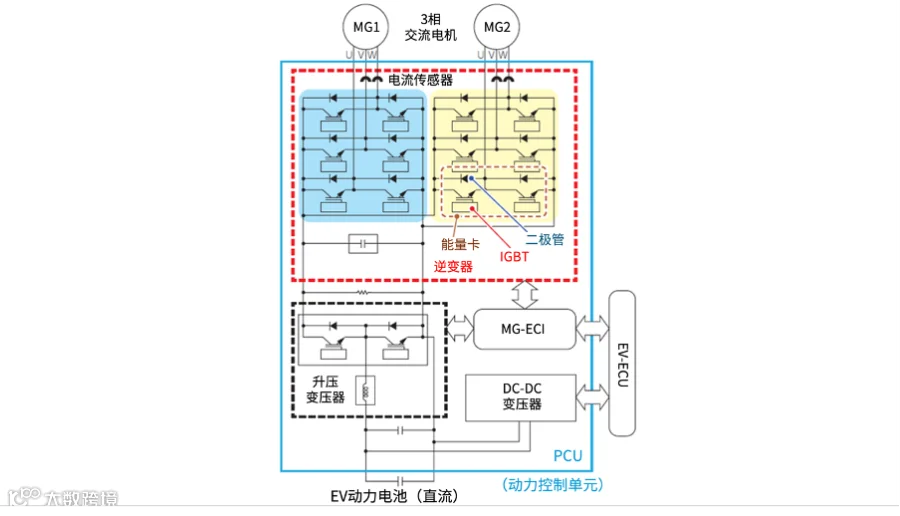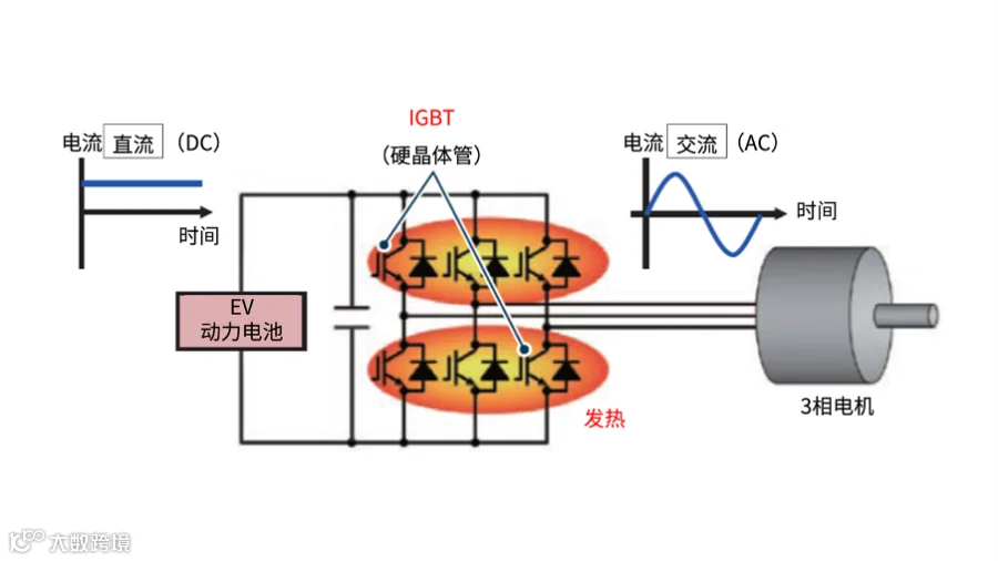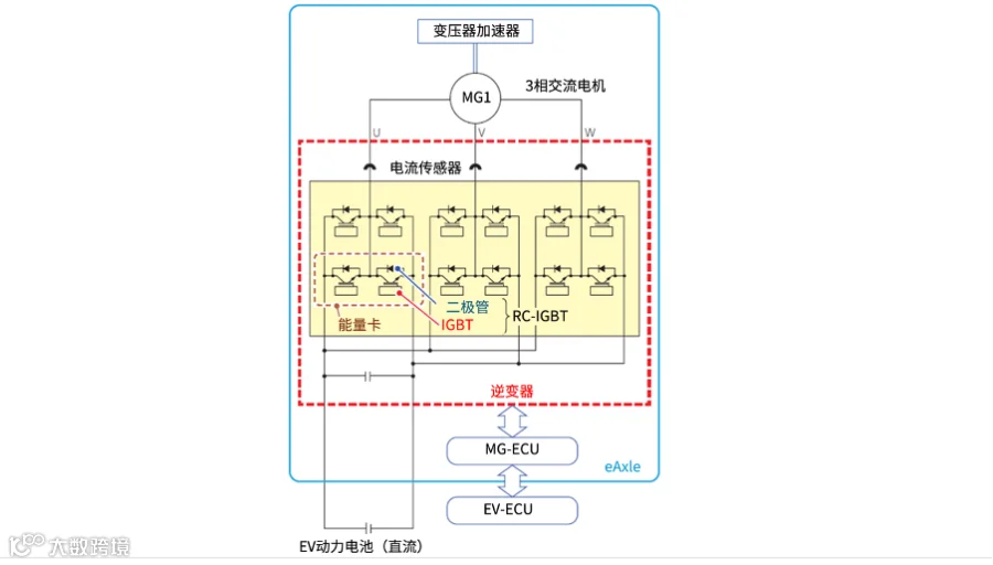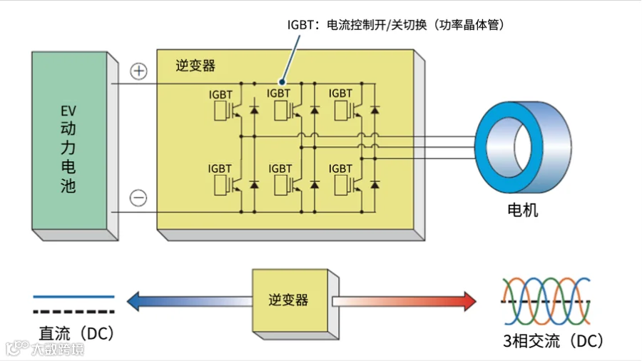 为了输出能够驱动电机的交流电,无论是 HEV(混合动力汽车) 还是 BEV(纯电动车),逆变器通常采用由 IGBT 与二极管构成的电桥电路,形成三相输出。通过对这些半导体开关进行控制,系统便可以按照控制要求生成所需的交流电。