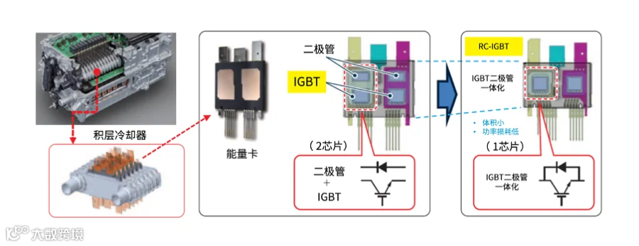 近年来,将 IGBT 芯片与二极管芯片进一步集成为一体的RC-IGBT(逆向导通型 IGBT)逐渐得到应用。这种结构带来的变化包括: