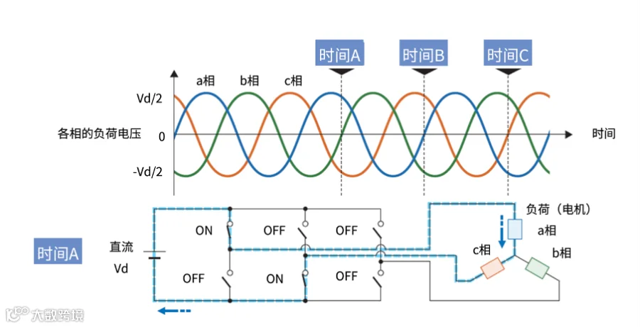 三相逆变器通常至少由 6 个 IGBT 构成。通过这些器件的开与关,电流的方向和大小会被不断改变,从而实现直流电与三相交流电之间的相互转换。为了便于理解,我们分几个阶段来看。