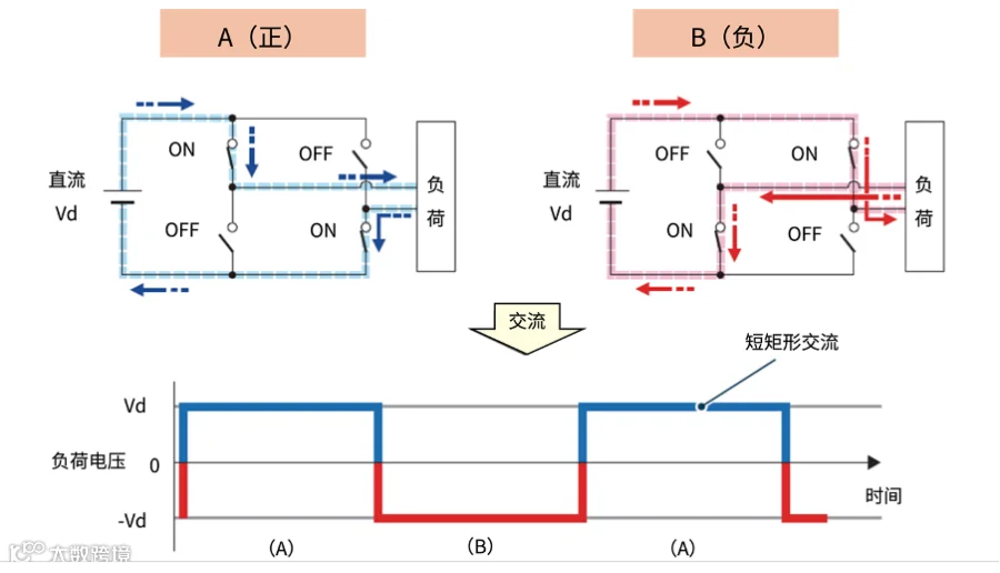 通过4个IGBT的开关动作改变电流方向,可以得到最基础的交流波形——矩形波。