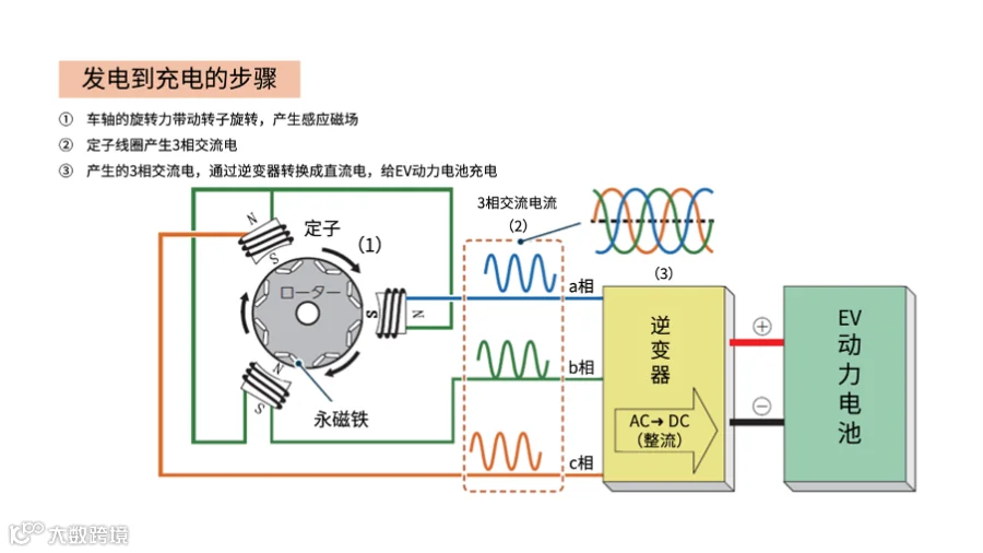 当车辆减速或制动时,电机转而利用机械能进行发电。