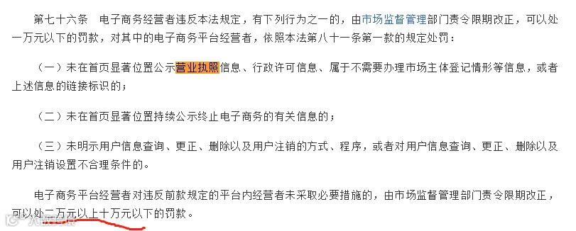 同时,第七十六条规定中,补充道:未在店铺首页公示营业执照信息的,将处罚二万元以上十万元以下的罚款。