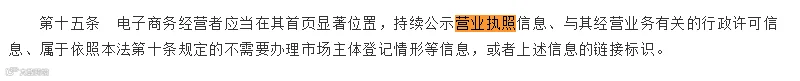 根据电子商务法第十五条规定:经营者必须在店铺首页显著位置,公示营业执照信息!