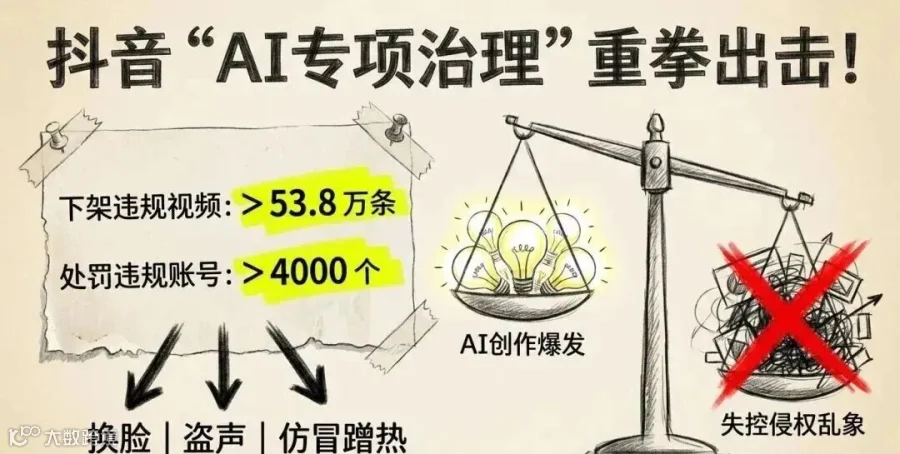4月中旬,抖音公布AI侵权专项治理成果:下架AI侵权视频53.8万条,其中仿冒蹭热度视频36万条、肖像及声音侵权内容8.5万条、"AI霸总"等诱导内容3万余条,累计处罚违规账号超4000个。平台重点打击AI换脸、盗声仿冒行为,但坦言行业普遍存在声音识别技术短板。