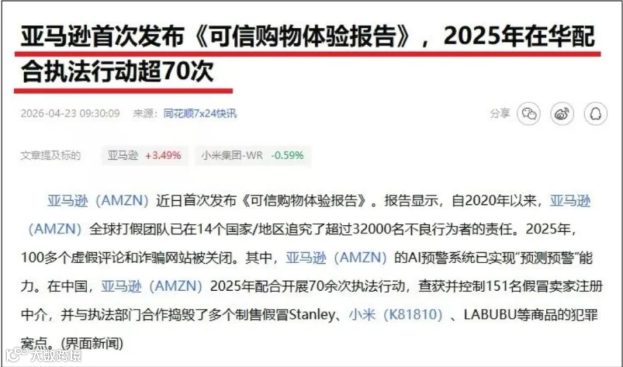 重拳治违规,65人锒铛入狱!报告显示,过去5年,亚马逊累计追究了32000多名平台不良行为者的法律责任,其中65人被直接送进监狱,最高刑期长达6年半,彻底打破了“违规顶多关店”的侥幸心理。