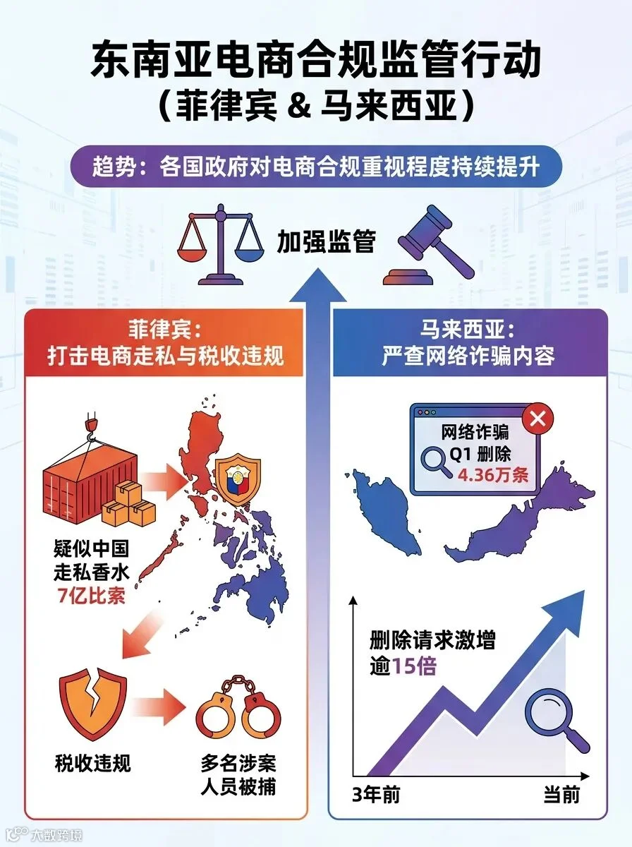 菲律宾方面,电商领域税收违规问题日益严重,当局查获价值7亿比索的疑似中国走私香水,并逮捕多名涉案人员。此前,菲律宾还查获了华商售私烟案,8个月赚20亿比索。马来西亚则大力打击网络诈骗,Q1删除4.36万条诈骗内容,删除请求三年激增逾15倍,显示各国政府对电商合规的重视程度持续提升。