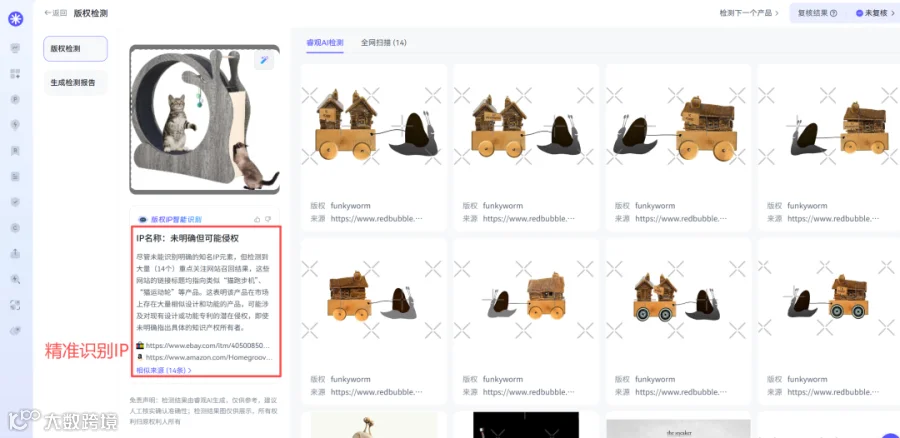 你需要查看的内容包括:风险等级、图片对比详情、版权登记库匹配记录、TRO维权历史关联(很重要)、全网在售相似产品。