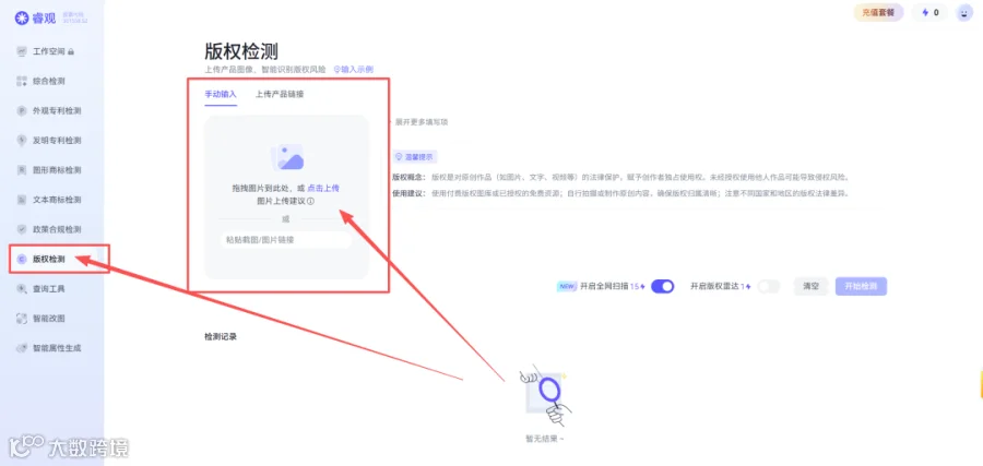 直接通过官网,就可以已进入到“版权检测”功能模块,直接操作就可以了