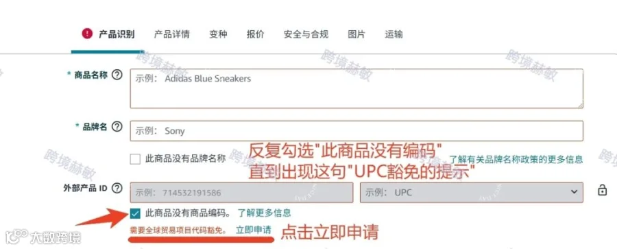 直到出现【需要全球贸易项目代码豁免】-点击立即申请-再回到listing保存并完成