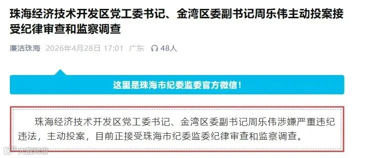 廉洁珠海发布通报显示,珠海经济技术开发区党工委书记周乐伟已主动投案。作为横跨政企系统的典型干部,其履历涵盖珠海航展公司、会展局、金湾区及格力集团等关键岗位,展现出政府与企业运作的双重经验。