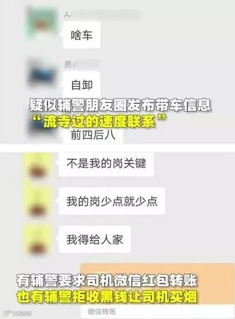 还有另外一段视频,是在白天的时候,这辆货车同样也是不符合正当规定,最后这司机给这辅警塞了钱,同样还是直接放行,还有更为猖獗的,直接在朋友圈里发信息要在这个关口过车的大货车司机马上联系自己,让司机微信红包转账给他,就都可以放心,无阻通过,还有一些辅警害怕被查,不收钱,收烟。