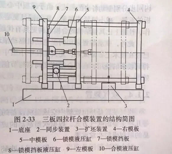三板双拉杆合模机构是目前在用的大中型吹塑设备中使用最多的一种合模机构,大多200L全塑桶吹塑设备的合模机构采用这种结构形式。在高压锁模装置上不同厂家采用了不同的结构形式,有采用增压液压缸的,有采用销锁液压缸的,还有采用直压液压缸的。下图所示为双拉杆合模机构简图。