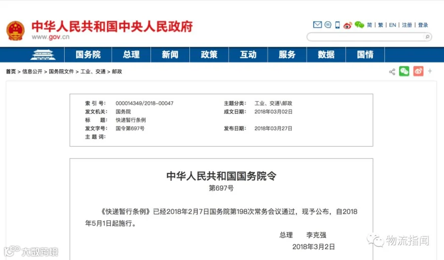 国务院总理李克强日前签署国务院令,公布《快递暂行条例》(以下简称《条例》),自2018年5月1日起施行。