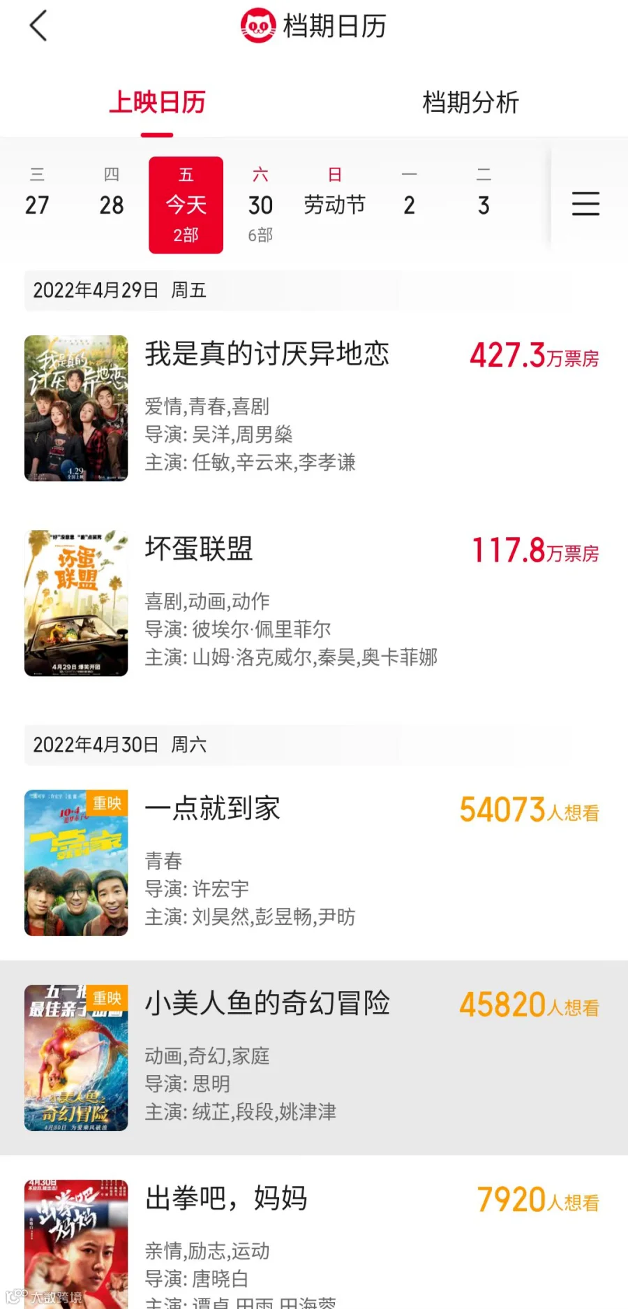 由于疫情影响,前几天的影院营业率较为低迷,灯塔专业版数据显示,截至4月28日,全国有6583家影院营业,营业率为54.7%,而过去几天,日票房维持在800万元以内,观影人次极低,影院上座率普遍不及2%。以4月28日为例,全国排名第一的影院为深圳百老汇电影中心(IMAX万象天地店),该店当日分账票房为2万元,观影人次仅382人。4月28日全国各地影院营业率才逐渐呈现回暖现象。