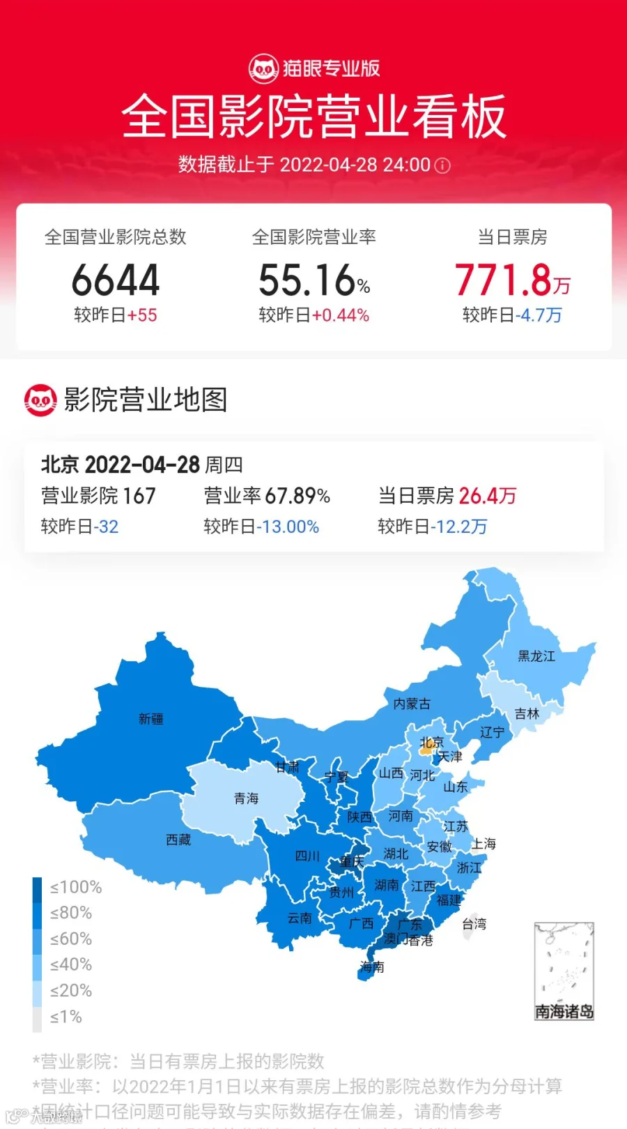 截至4月28日,4月27日大盘票房771.8万,营业影院6644家,较上日增加55家,全国营业率55.16%,成都、广州、泰州等多地影院复工。