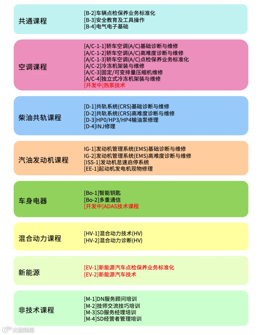 针对汽车的部件和类型以及非技术类的咨询服务分别设有8大系列,共有27门课程,新开发的课程有热泵技术、ADAS技术、以及新能源汽车技术等,详细内容请见下图~