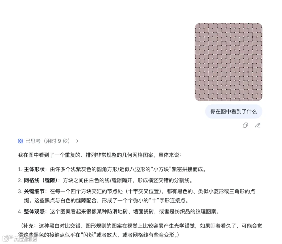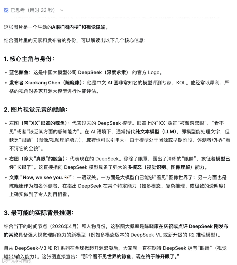 继上周发布V4版本后,DeepSeek突然推出识图模式灰度测试,标志着其备受期待的多模态能力正式落地。更新后的网页版及App用户已可体验该功能。项目组研究员通过推特释出"Now, we see you"信号,经实测,DeepSeek成功解析出图像中无文字隐喻,精准推断出这是关于多模态更新的宣告,并总结道:"那个看不见世界的鲸鱼,现在终于睁开眼了。"核心突破在于其推理机制:不同于传统AI仅描述表层元素,DeepSeek主动溯源发布者身份、分析品牌标识及符号隐喻。面对推特截图,模型会深度追问"创作者意图"与"潜在语义",模拟人类观图时的自然思维路径。特别值得注意的是其思维纠错机制:当一度将眼罩误联至动漫《天元突破》时,能自我修正;更创新性建立"思考答辩会"流程——先验证客观事实,再判断事件性质,最后形成结论,完整复现人类认知决策链条。基础能力测试显示:日常场景识别准确率较高,如电影剧照、抽象图像及商品图均能精准解析。响应速度达半秒级,满足实用需求。目前存在两方面局限:一是在极端测试场景(如数手指、特定爱心图案)中仍有误差,需交互引导才能修正;二因未接入实时搜索,仅基于知识库作答,对2023年后新事物(如苹果Finder吉祥物)及HEIF格式图片尚不支持。该功能上线标志着国产大模型在视觉理解领域取得实质性进展。随着多模态能力持续迭代,国内AI生态格局有望迎来新一轮调整。
