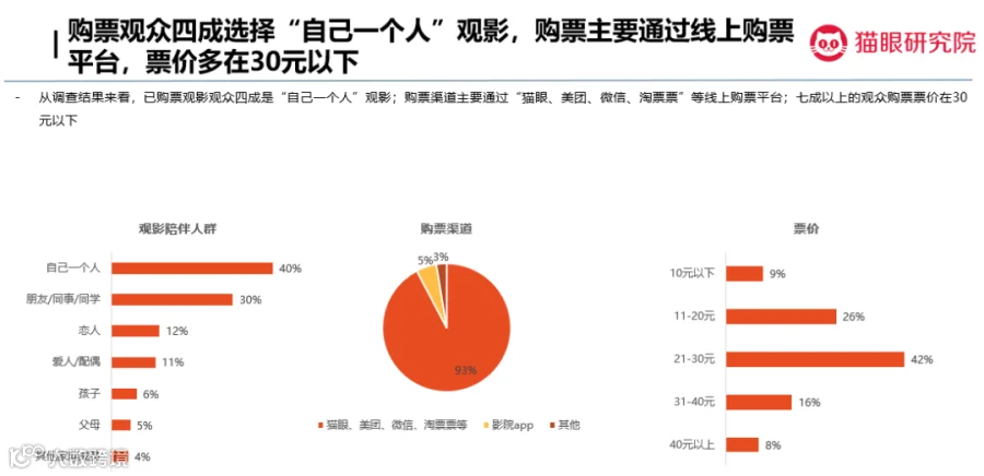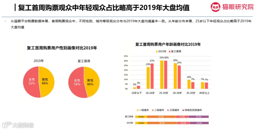 此次调查面向猫眼平台大盘观众及影院复工后首周购票观众发起,样本性别比例、城市结构及年龄比例与电影大盘观众构成接近。