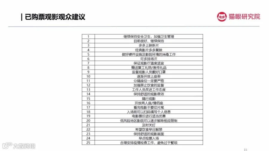 已购票观影观众,也对影院复工复产提出了相关建议。粗略来看,这些建议可以分为三类: