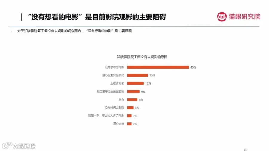 为帮助业界更好了消费者情况,近日,猫眼研究院推出第四期观众观影意愿跟踪调查,分析观众在影院复工后的观影意愿变化,助力行业更好复工复产。
