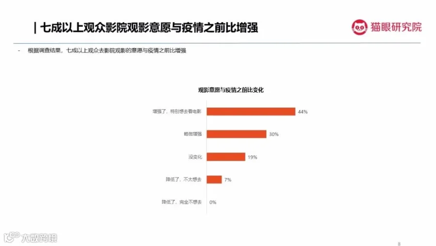 与关注度一同反弹的,是大部分观众观的影意愿。数据显示,七成以上观众去影院观影的意愿比疫情之前增强。