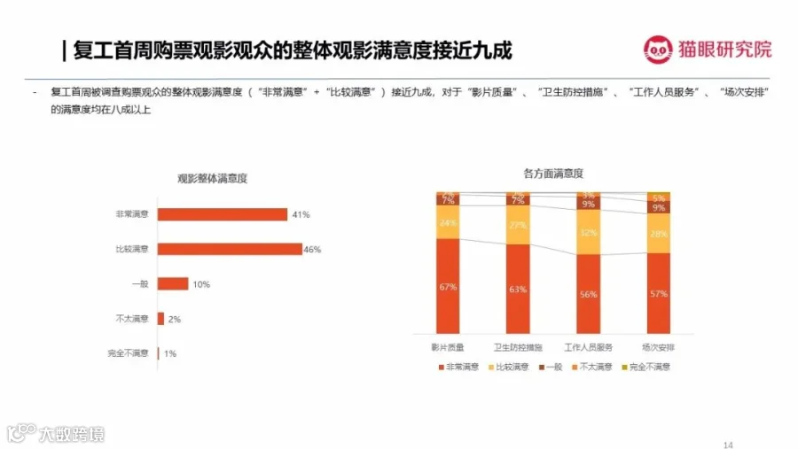 猫眼研究院数据显示,复工首周,影院在服务态度,各项防控措施方面得到绝大部分观众的认可。其中,九成以上的观众认为影院复工的各项措施符合相关规定。对于影片质量、卫生防控措施、工作人员服务、场次安排的满意度也达八成以上。