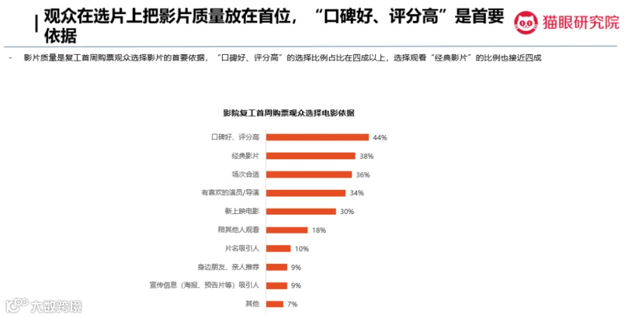 猫眼数据显示,复工首周,影片质量成为观众选择影片的首要依据。四成观众会选择“口碑好、评分高”的影片,选择观看“经典影片”的比例也接近四成。与之相应,对知晓影院复工但未去观影的观众而言,“没有想看的电影”是主要阻力。