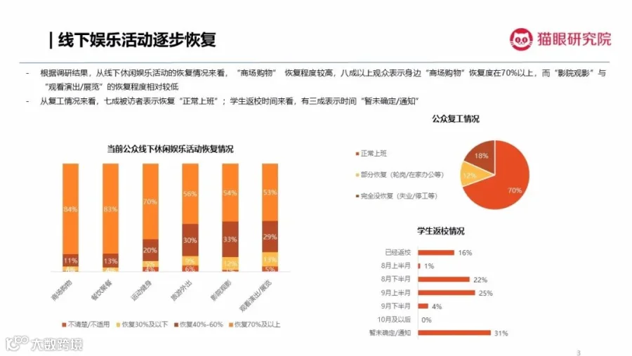 从调查结果来看,经历一段时间的复工复产后,国内线下娱乐活动已进入稳步恢复阶段。