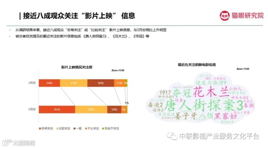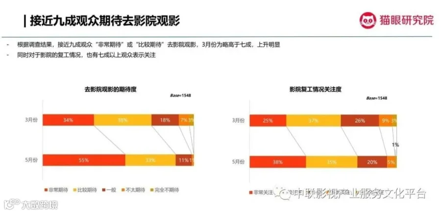 线上观影很难满足大众的观影需求,猫眼的数据中显示,3月疫情期间,期待去影院观影的观众比例在七成左右,如今这一比例已经上升至九成。