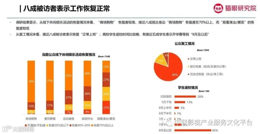 调研结果显示,八成受采访者表示恢复“正常上班”,五成以上学生表示已经返校。线下休闲娱乐活动各省市也陆续开放,商场购物能力有显著的提高,有将近八成的观众表示现在商场的购物已经恢复到将近70%。