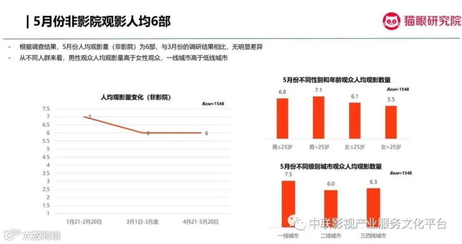 事实上,即便复工复产时期休息时间减少,观众仍保持极高的观影热情,5月,人均观影量(非影院)为6部,和三月持平。