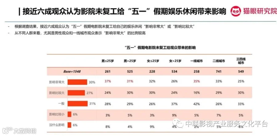 从猫眼调查报告中结果中显示,近六成的观众认为,五一假期电影院未能复工,给自己的娱乐休闲带来了的“影响非常巨大”。