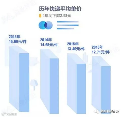 快递行业有个怪圈——“涨价找死,不涨价等死”,近几年不时会传来快递涨价的消息,但实际情况却是一年比一年便宜,公开数据显示,2013年-2016年间,快递服务平均单价保持着“每年降一块”的幅度,分别为15.69元/件、14.65元/件、13.40元/件和12.71元/件,4年间下降2.98元。