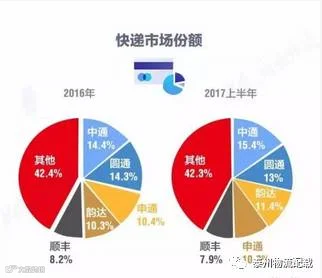 由中通、申通、圆通、韵达构成的“三通一达”,已占据中国快递行业的“半壁江山”,根据2016年全年以及2017年上半年的快递企业市场份额显示,“三通一达”已经占到49.4%和49.8%。