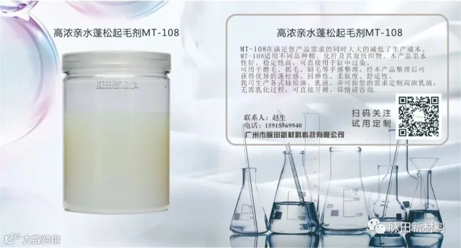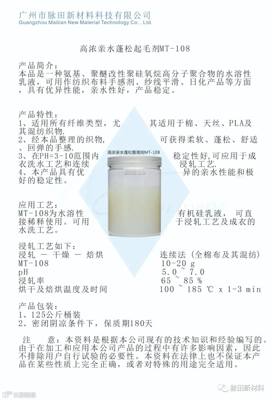 MT-108适用不同品种棉、化纤及其混纺织物。本产品亲水性好,稳定性高,可直接用于缸中过染。可用于磨毛、抓毛、刷毛等手感整理,经本产品整理后可获得优异的蓬松感、回弹性、柔软度、舒适性。我司生产各式硅原油、乳液,并可按您的需求定制高浓乳液,无需乳化过程,可直接开稀。