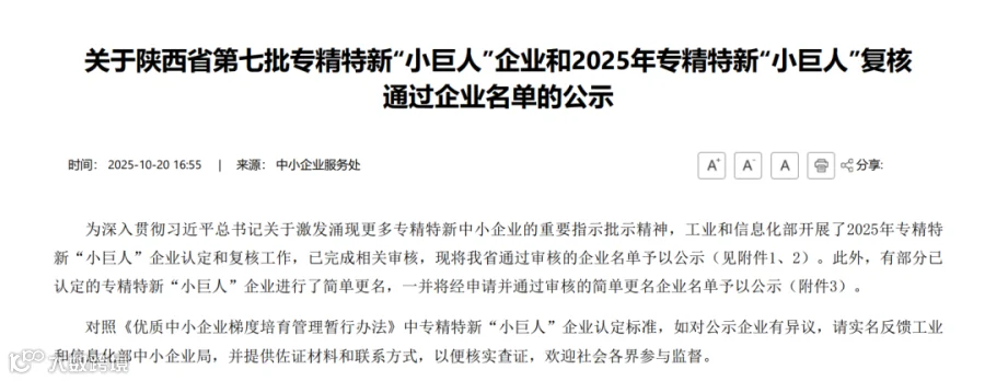 近日,陕西省工业和信息化厅公布《关于陕西省第七批专精特新“小巨人”企业和2025年专精特新“小巨人”复核通过企业名单》,我公司成功通过复审,继续跻身国家级专精特新“小巨人”企业行列。
