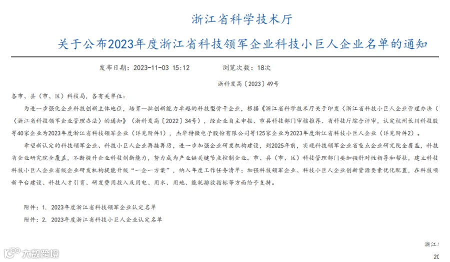 近日,浙江省科学技术厅发布了《关于公布2023年度浙江省科技领军企业、科技小巨人企业名单的通知》,