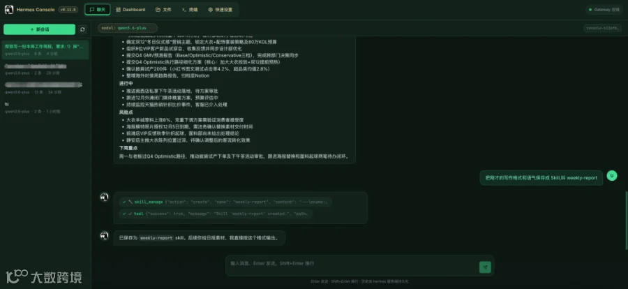 例如,让 Hermes Agent 根据我的日常工作记录来生成周报。第一次生成的时候,可以详细教它怎么写,然后让它沉淀为 skill,以后就可以一句话搞定。