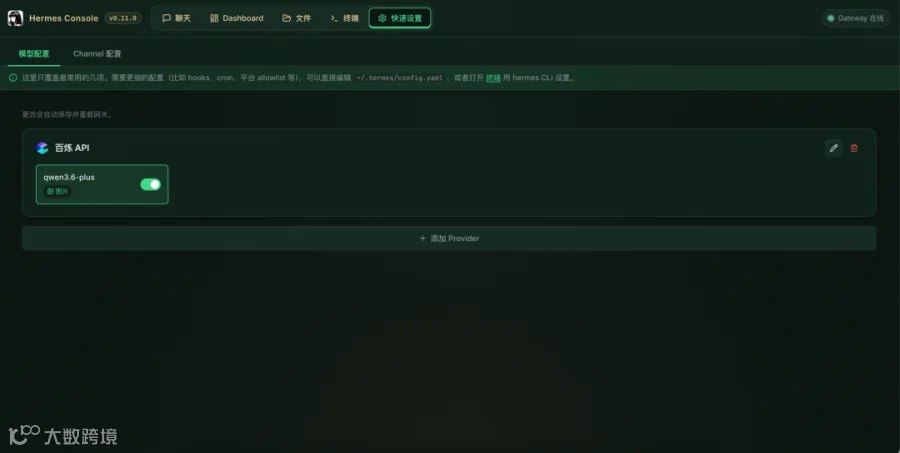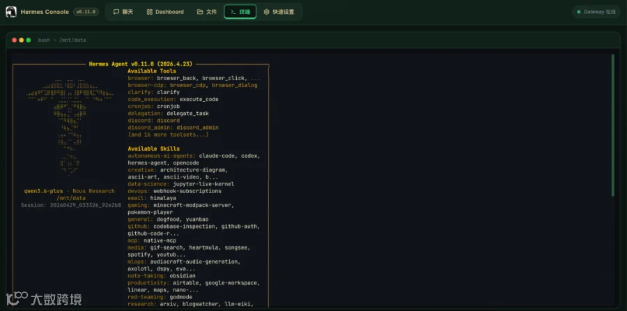 4. 除了对话页面之外,您也可以进入终端,执行 hermes 命令后,通过命令行交互。