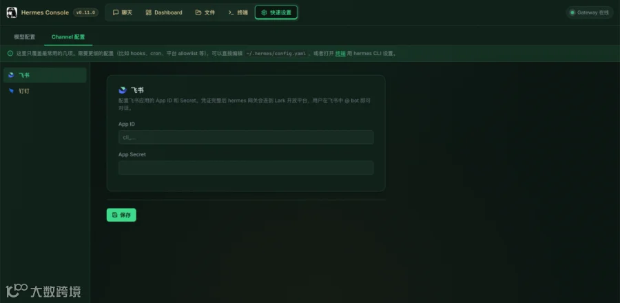 5. 您还可以在 快速设置 页面中配置钉钉企业应用的 Client ID 和 Secret,以及飞书应用的 App ID 和 Secret。更多详细说明请参见:钉钉配置[9]、飞书配置[10]。