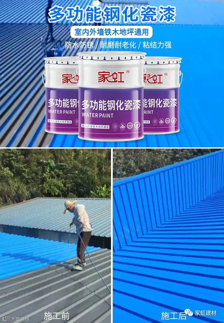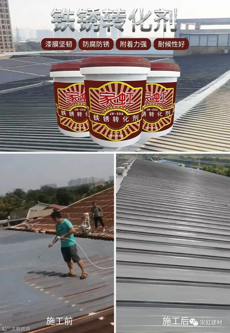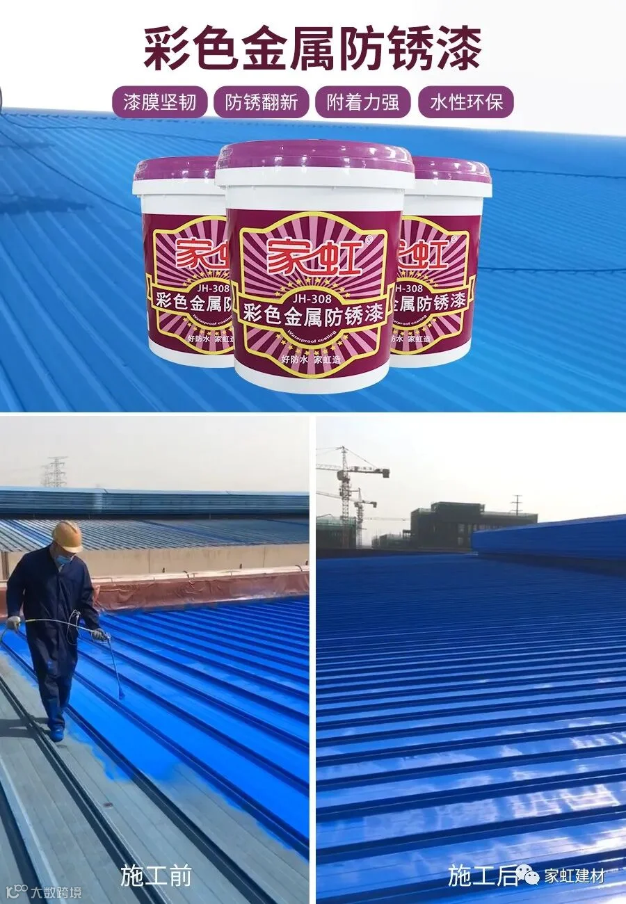 本产品是彩钢瓦防锈翻新的热门材料,施工后防锈翻新、颜色亮丽多样,水性环保,附着力、耐候性好,在彩钢瓦厂房、钢结构翻新上很受欢迎。