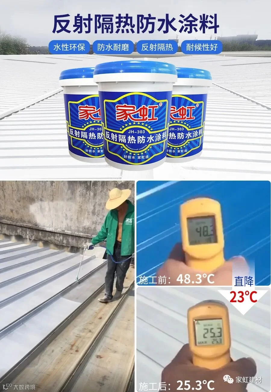 夏季炎热,大多数厂房、楼面,受阳光直射,夏季高温,传统空调降温方式并不适用于所有场景,安装人工时间成本高,反射隔热防水涂料施工便捷,成本低,防水翻新,降温效果显著,大大解决的夏季屋面降温隔热的问题。