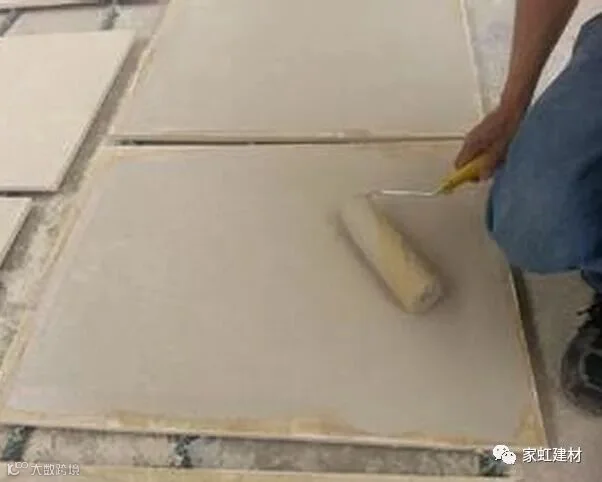 单组份背胶,开桶即用,无需搅拌。使用滚筒将背胶均匀的滚涂在瓷砖背面,等待背胶干燥透明后就可进行瓷砖铺贴。