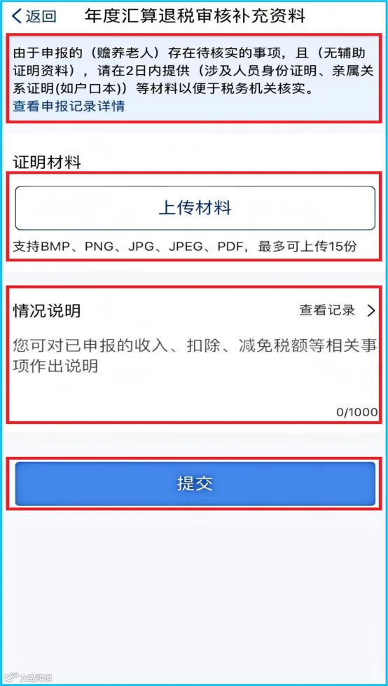 您提交退税申请后,税务机关可通过个税APP及手机短信、电话等方式开展提醒,接收该消息后,请您及时补充资料或者更正汇算清缴申报。如需补充资料,可在个税APP【待办】的“补充年度汇算退税审核资料”事项,点击【去处理】,根据税务机关审核意见【上传资料】并填写【情况说明】后点击【提交】。