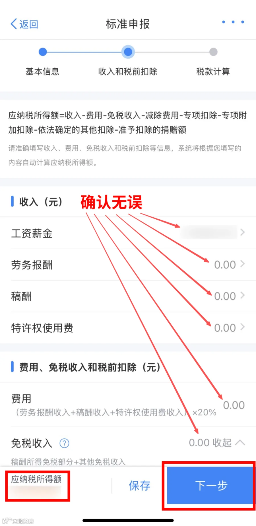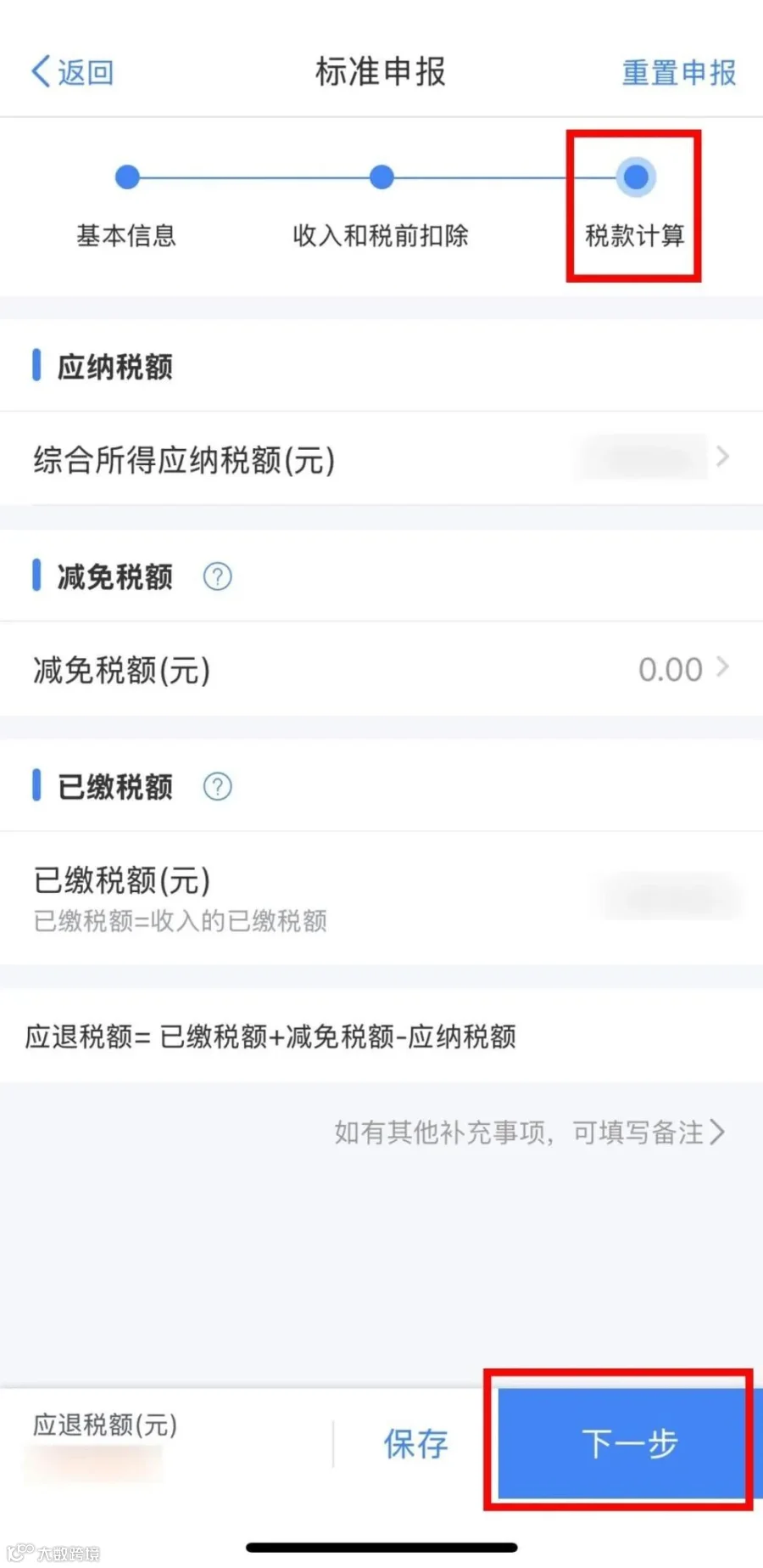 系统会根据您填报的信息,自动计算出您的【应补税额】或【应退税额】,并在左下方显示。如您确认相关数据无误,则可以点击【下一步】、【提交申报】进行缴款或退税。