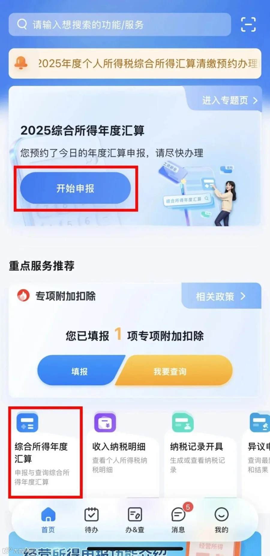 登录“个人所得税”APP申报,您可以通过以下入口进入年度汇算