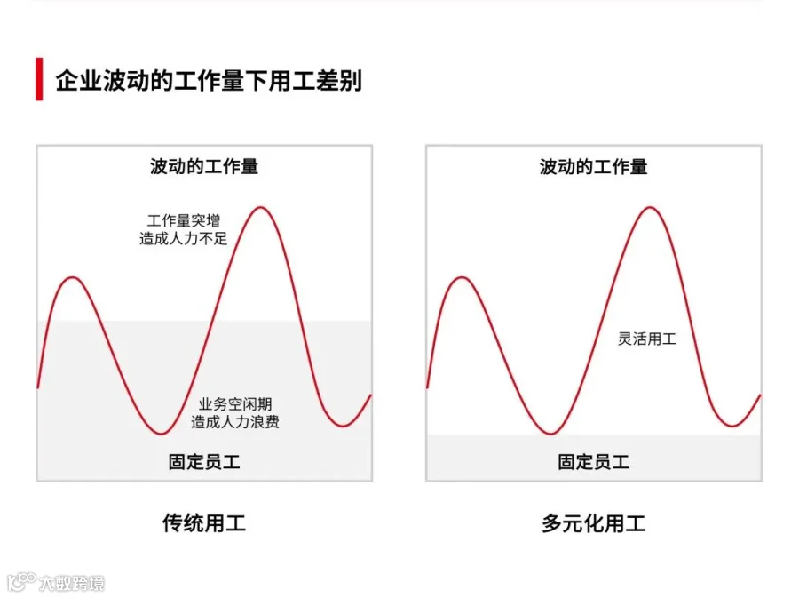 多元化用工是标准用工与灵活用工相结合的新型用工模式,企业不仅可以选择传统的标准用工,也可以基于企业短期内的项目及用工模式,根据用人需求的波峰波谷来灵活地按需雇佣人才,并采用多种用工方式组合,更有效地应对业务的快速变化。